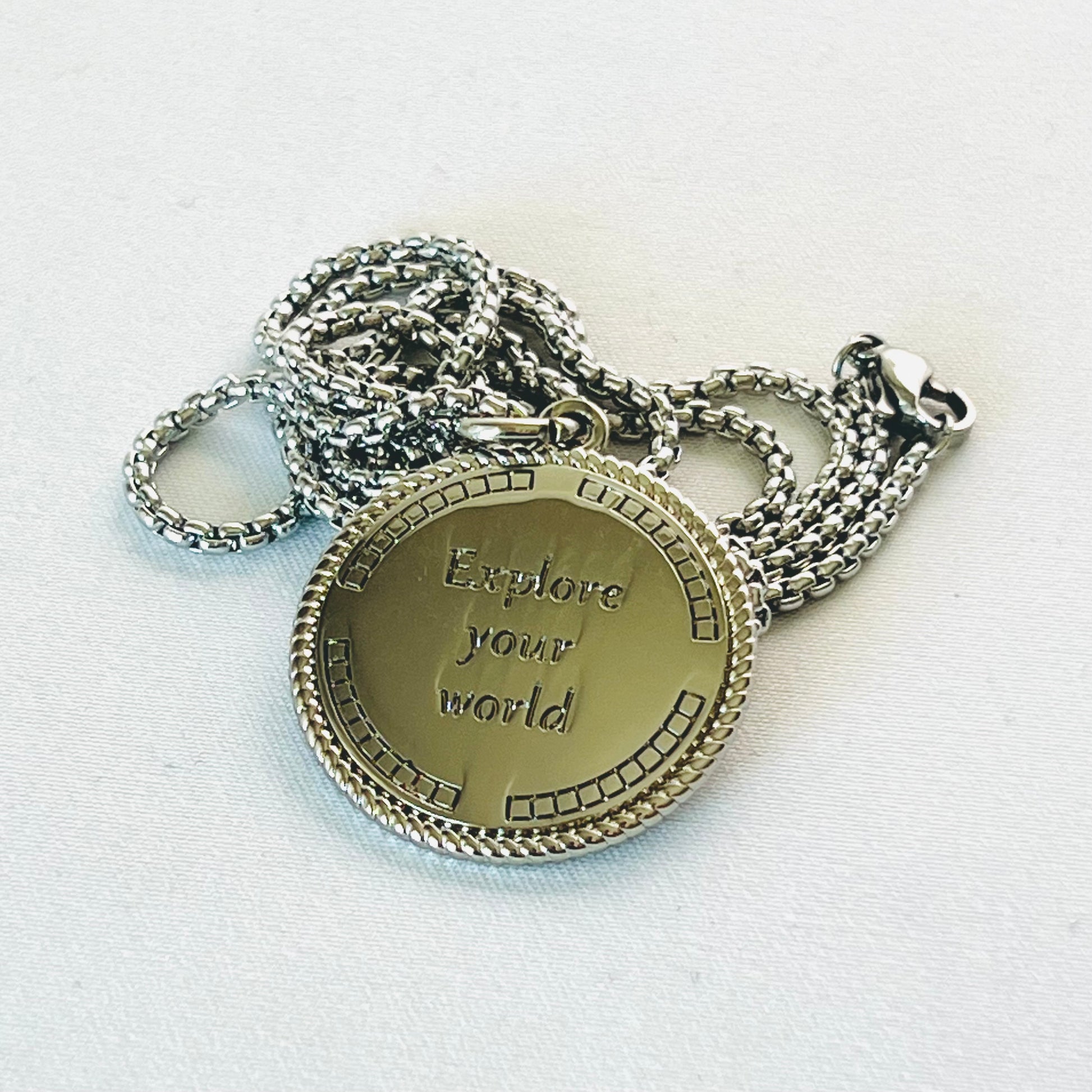 On the reverse, an engraving reads “Explore Your World” — a reminder to seek new paths, embrace possibility, and move with confidence. Masculine, meaningful, and versatile, this necklace is more than an accessory; it’s a gift of direction and inspiration.