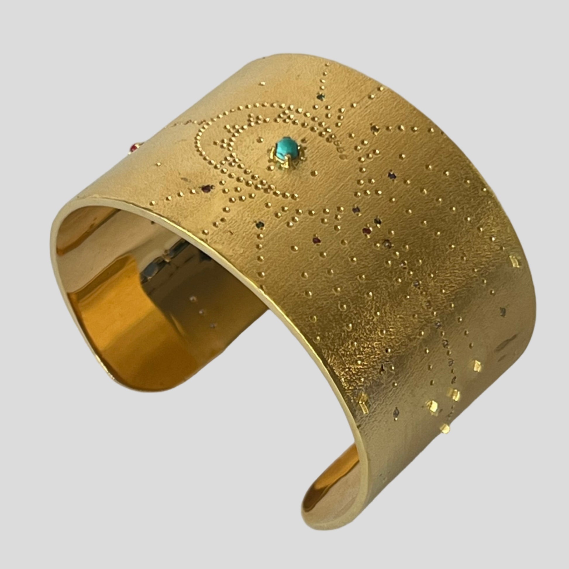Tiny coral and turquoise cabochons, along with multicolored white zircons, add subtle sparkle — like constellations catching the light. Whether worn solo or stacked, this cuff brings a sense of mystery and refinement to any look.