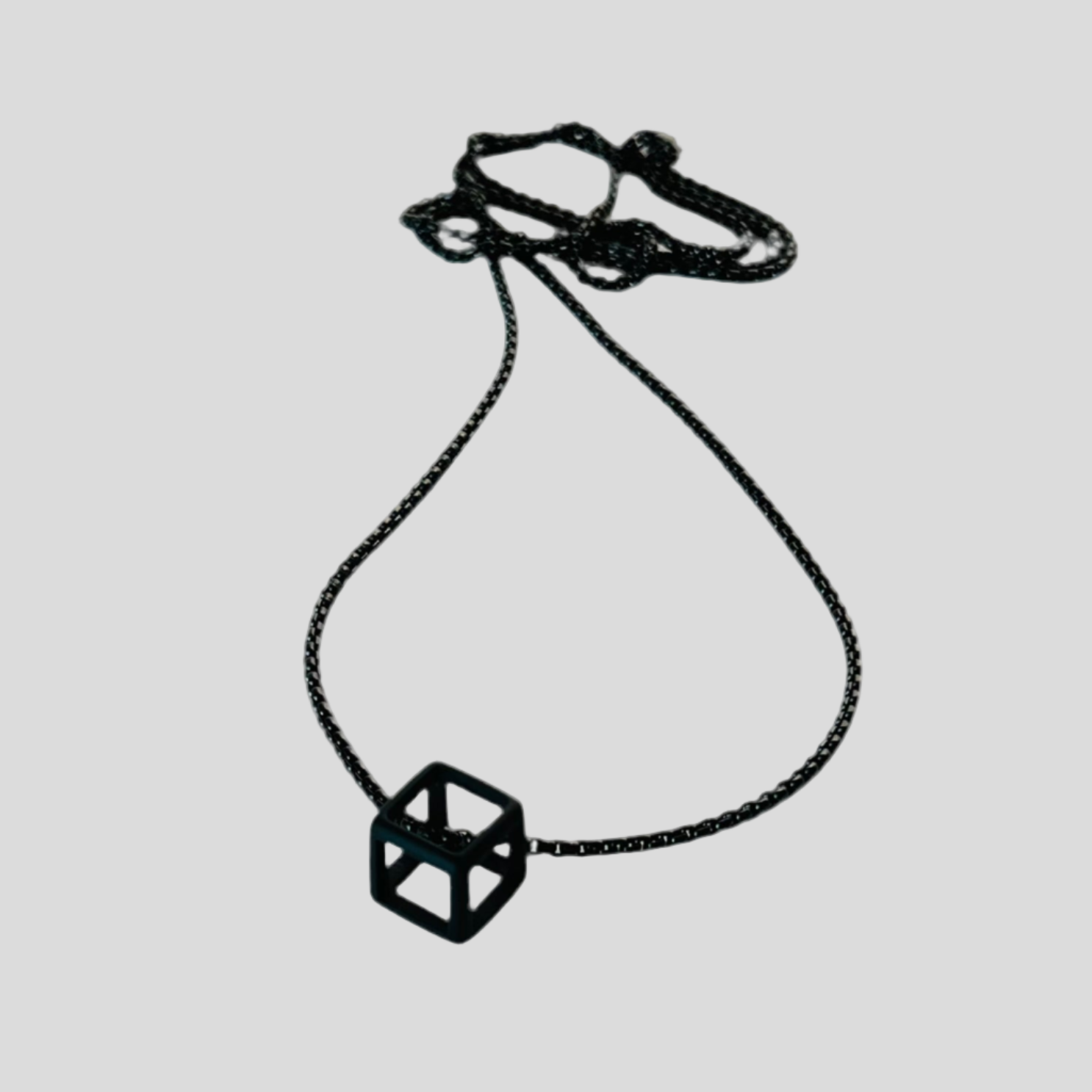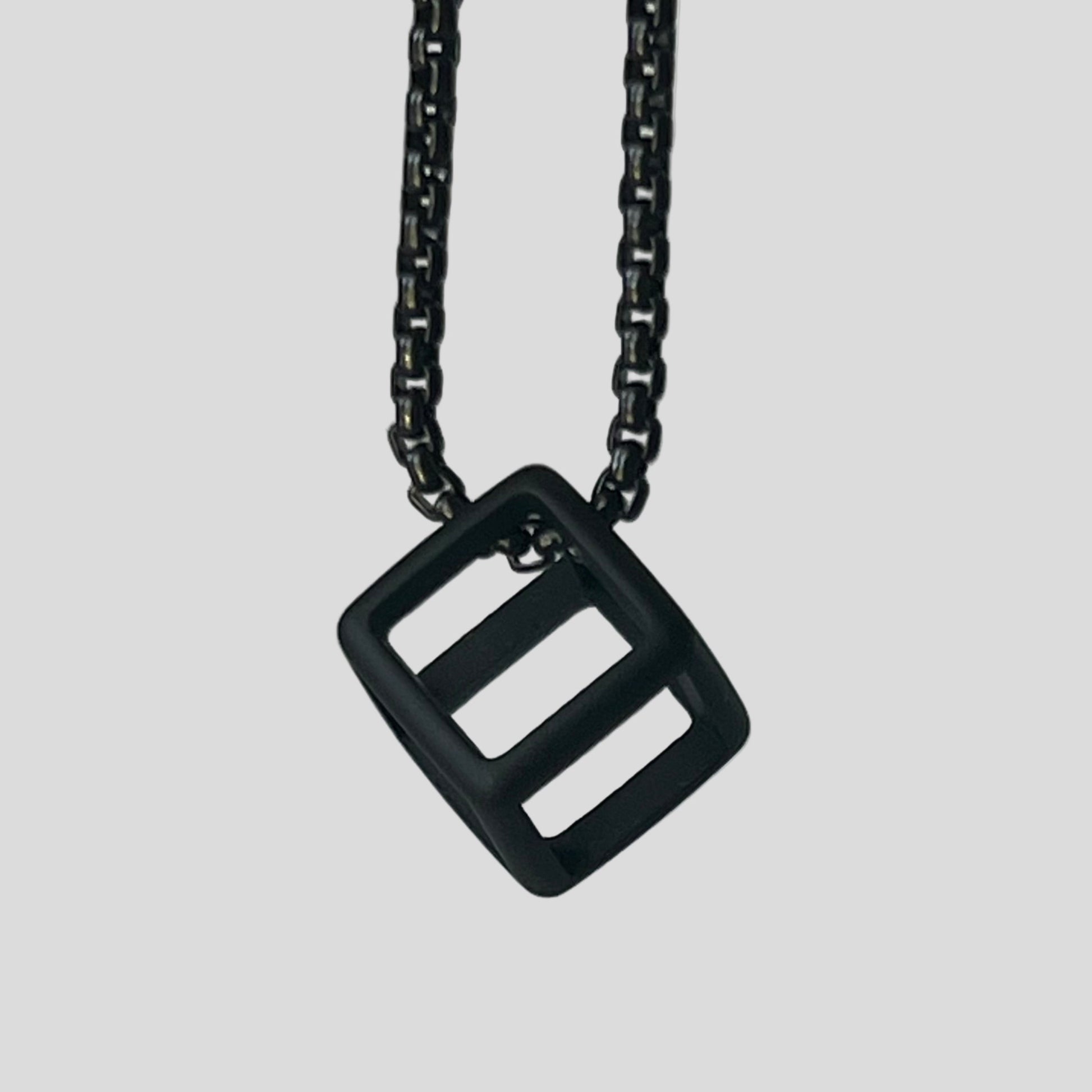 A bold play on form and dimension. The Obsidian Cube Necklace features a 3D open-frame pendant in deep black, threaded seamlessly onto a matching 27.5" stainless-steel box chain. The result: sharp geometry with a sleek, minimalist edge.